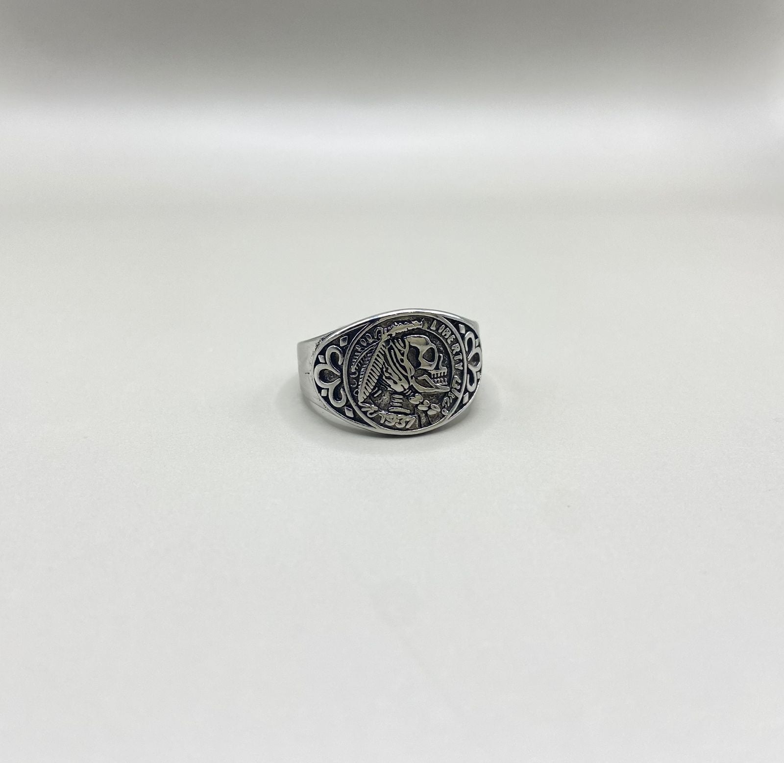 Un diseño imponente que fusiona lo clásico con lo alternativo. Este anillo plateado presenta un grabado en forma de moneda antigua, donde destaca una calavera con tocado tribal, rodeada de detalles ornamentales que le dan un aire vintage y misterioso.